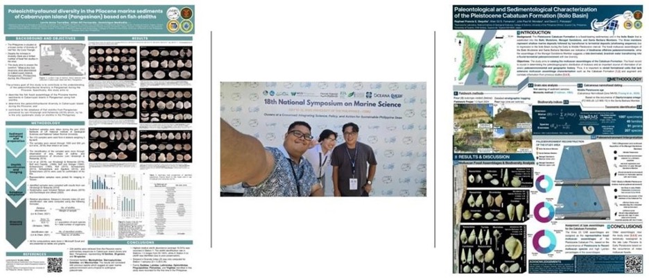 Dr. Fernando presented Lorrie’s research titled “Paleoichthyofaunal Diversity in the Pliocene Marine Sediments of Cabarruyan Island (Pangasinan) Based on Fish Otoliths”, which reconstructed the composition of ancient fish communities in Pangasinan during the Pliocene through the analysis of fossilized fish ear bones (otoliths). Meanwhile, Raphael presented his thesis, “Paleontological and Sedimentological Characterization of the Pleistocene Cabatuan Formation (Iloilo Basin)”, which explored the depositional environment, fossil mollusc content, and stratigraphic significance of the Cabatuan Formation. His outstanding work earned him First Place in the Student Poster Presentation category under the Nemenzo Award for Best Student Presentations.