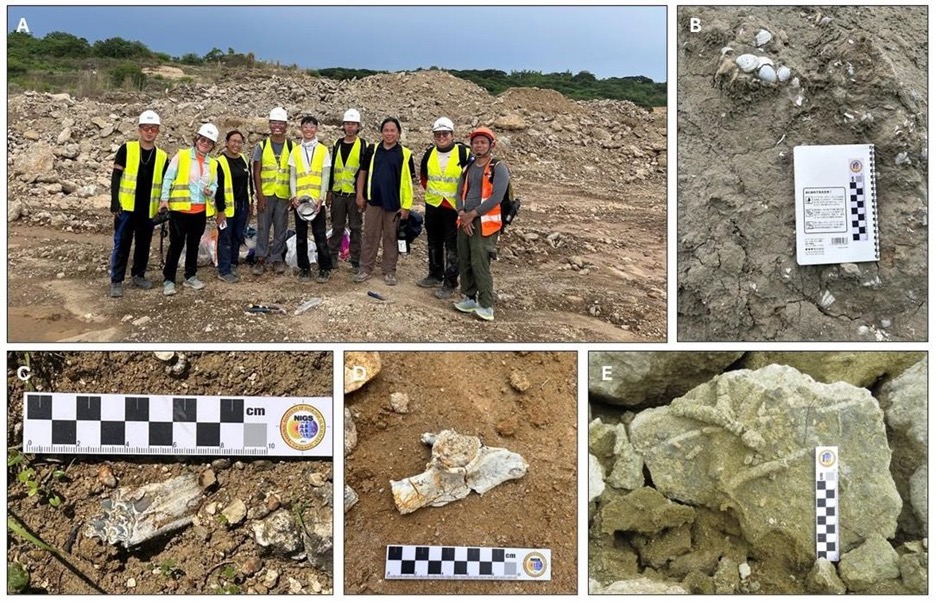 (A) Members of the fieldwork (from left): Lemuel Fernandez, Chatty Go, Abigael Castro, John Dominique Pagay, Nathan Raphael Marquez, Miguel Joven Villanueva, Dr. Allan Gil Fernando, Meyrick Tablizo, and Joeven Austine Calvelo; (B) Mollusc and echinoid fossils from Cataguintingan Formation in Bauang, La Union; (C-E) Fossils from Bacnotan, La Union – (C) bovid tooth, (D) hipbone of an unidentified vertebrate animal, (E) Thalassinoides ichnofossil.