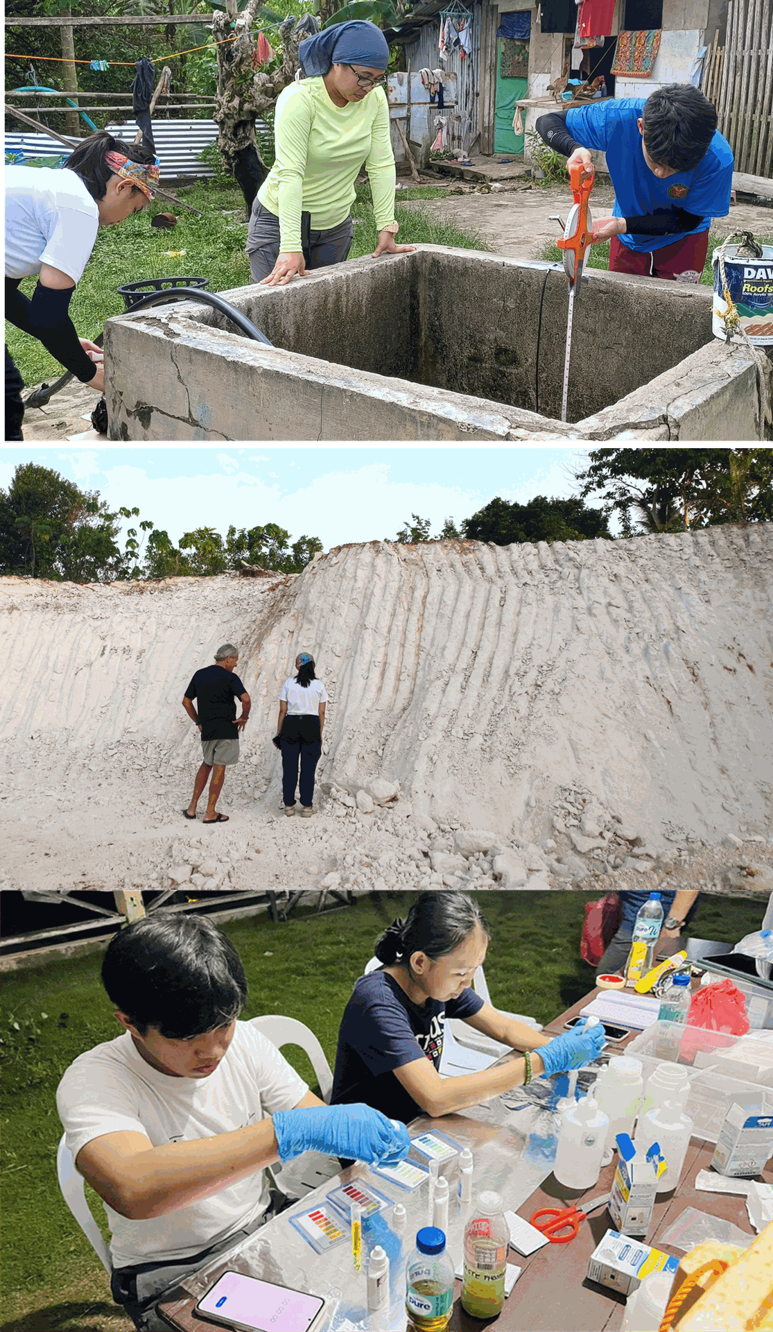 (top) water level gauging of a hand-dug well (middle) geologic reconnaisance (bottom) water quality analysis.